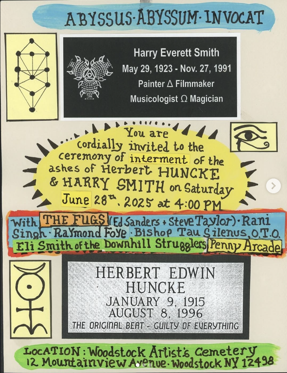 The interment of the ashes of Harry Smith and Herbert Huncke took place on Saturday, June 28th, at 4:00 PM at Woodstock Artist Cemetery, 12 Mountain View Ave., Woodstock NY 12498.