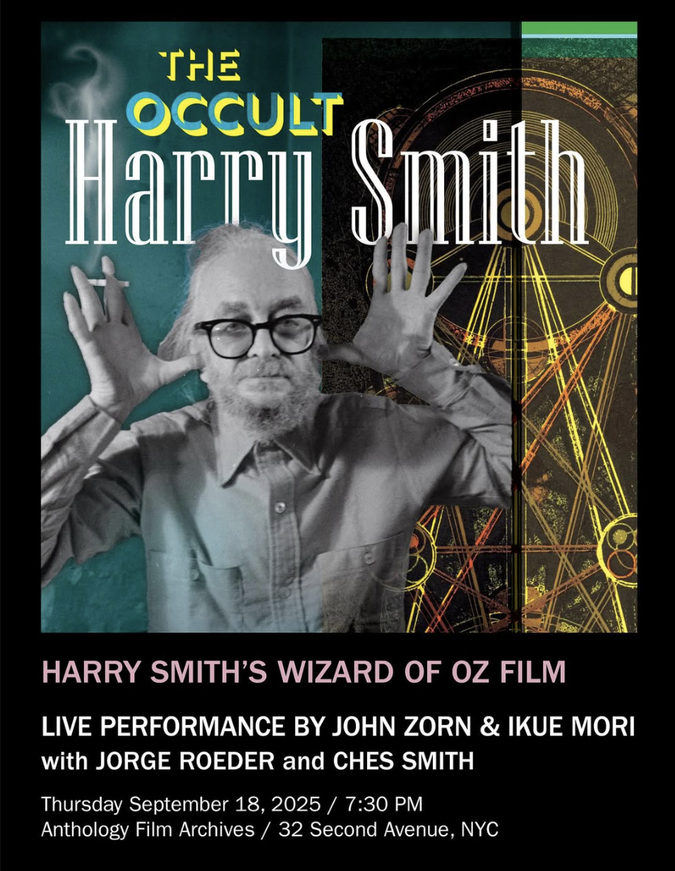 In 1980, Harry Smith combined his two Wizard of Oz-related films (FILM NO. 16 and 19) and called the new work FILM NO. 20: FRAGMENTS OF A FAITH FORGOTTEN. The film was to premiere accompanied by a live score at an Anthology fundraising event at Alice Tully Hall, but, unfortunately, the event was canceled and it never screened. As a special preview to our new 35mm restorations of FILM NO. 16 and 19, we present FILM NO. 20 for the first time ever with a live score by Anthology’s Composer in Residence, John Zorn, along with Ikue Mori, Jorge Roeder, and Ches Smith.